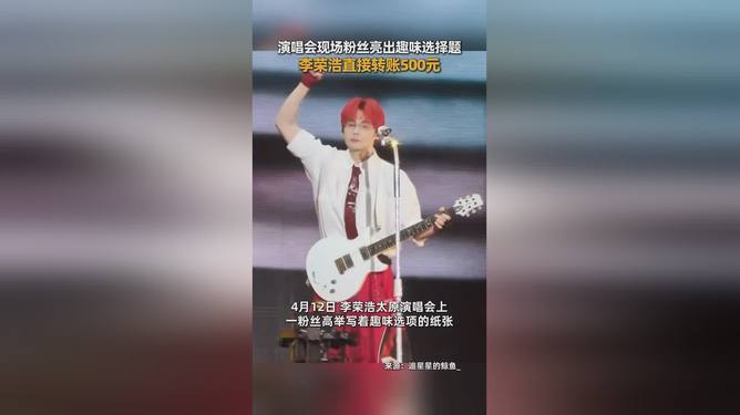 时间回日太原演唱会,下:00整的舞台上,聚光灯突然打向观众席一个举着灯牌的女孩。灯牌上赫然写着“A.转元 B.给我签名承包整个鱼塘”,二选一的戏谑让全场哄笑。李荣浩盯着灯牌愣𱄿秒,突然拿起话筒:“必须!”随即蹲在舞台边掏出手机,当万观众的面完成了转账。
